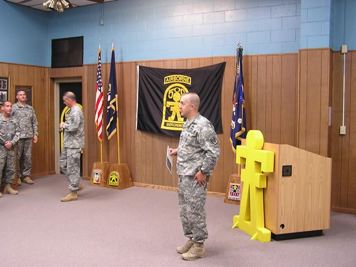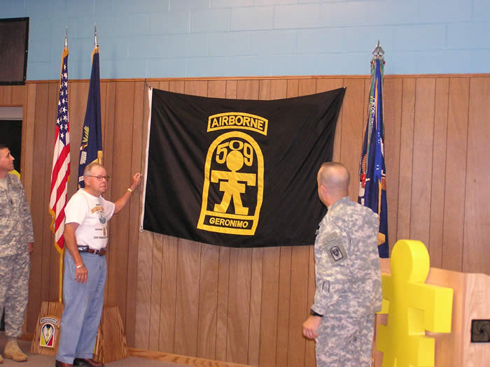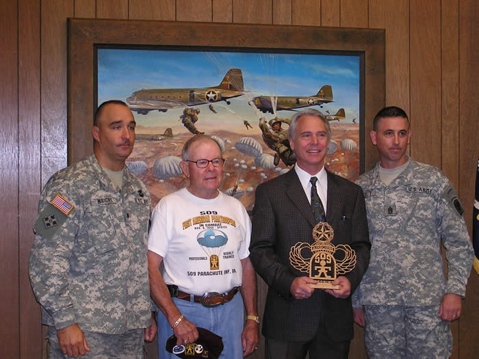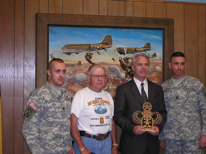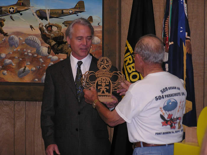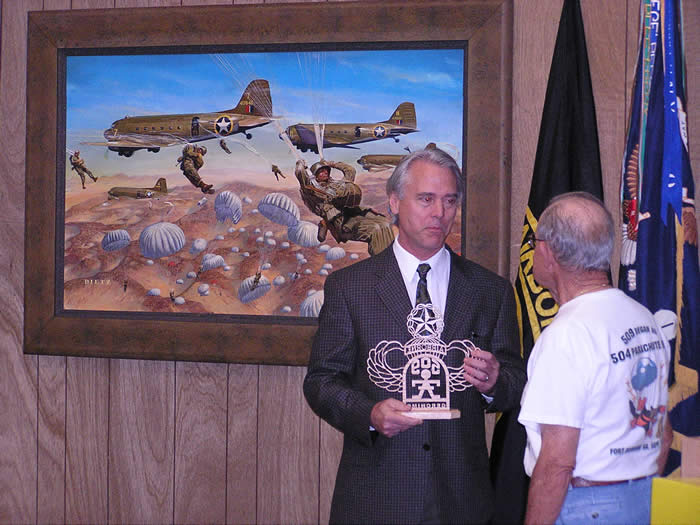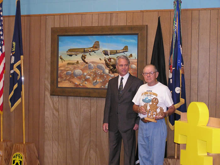 Veteran John DeVanie, President of the 509th PIA presents a custom wood carved 509th and Master Parachutist Wings on behalf of a grateful 509th to artist Mr. James Dietz.