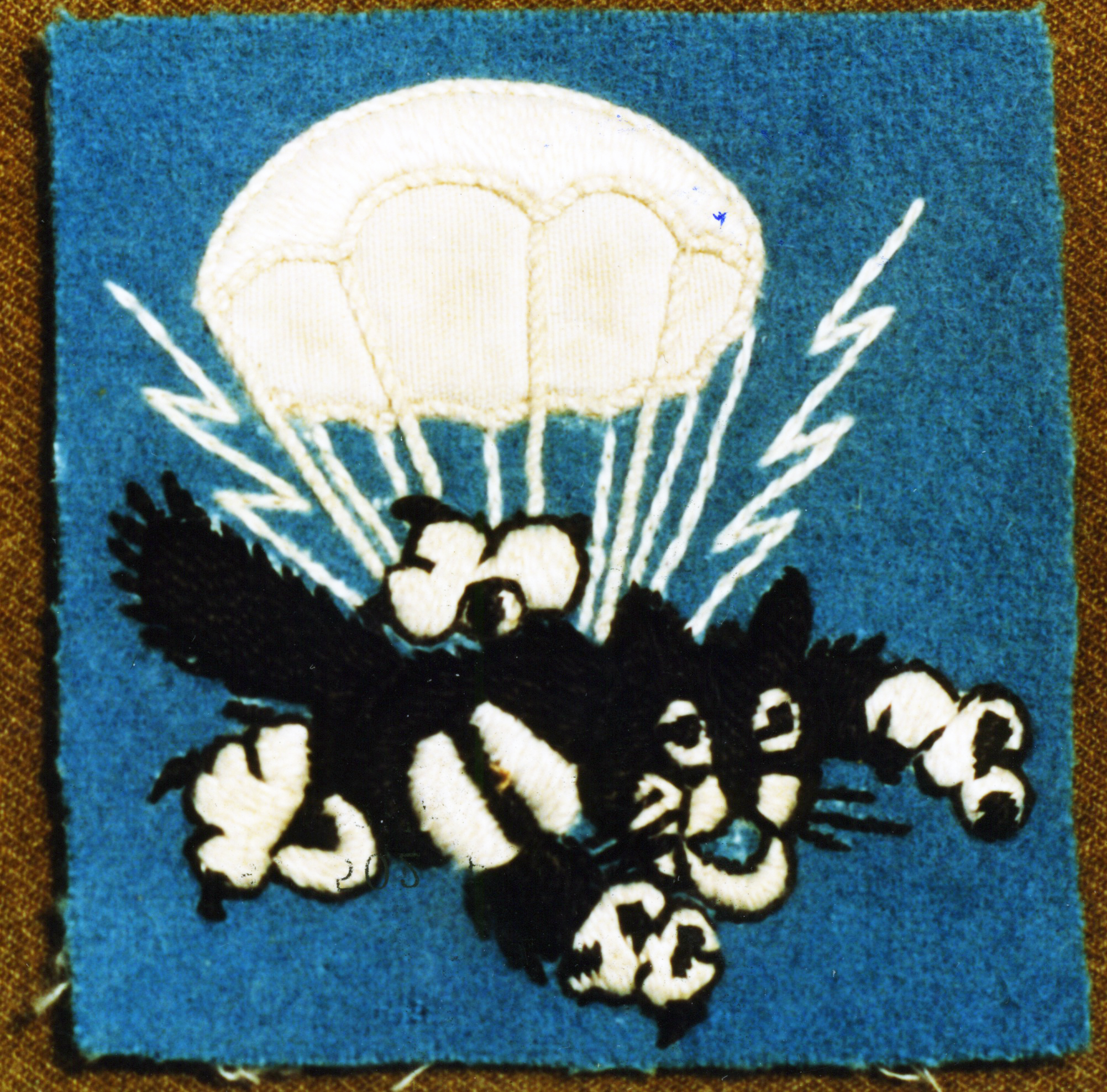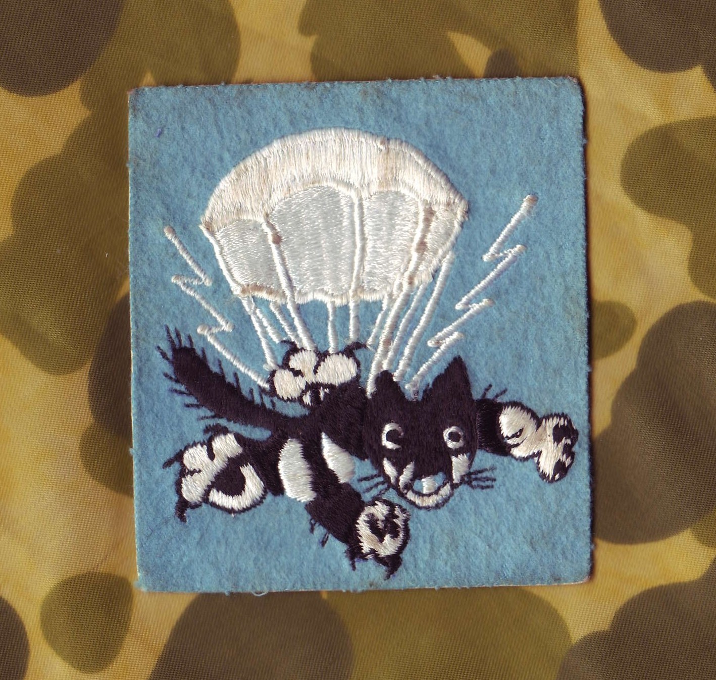 While the 2/503rd PIR (soon to be 2/509th PIR) was in England in 1942, the unit had the Cat Patch locally made. The theater made Cat Patch is different by the use of square blue wool background instead of the blue circle and white background found on US made Cat Patches. This was likely done due to English shops not being capable of producing fully embroidered patches.