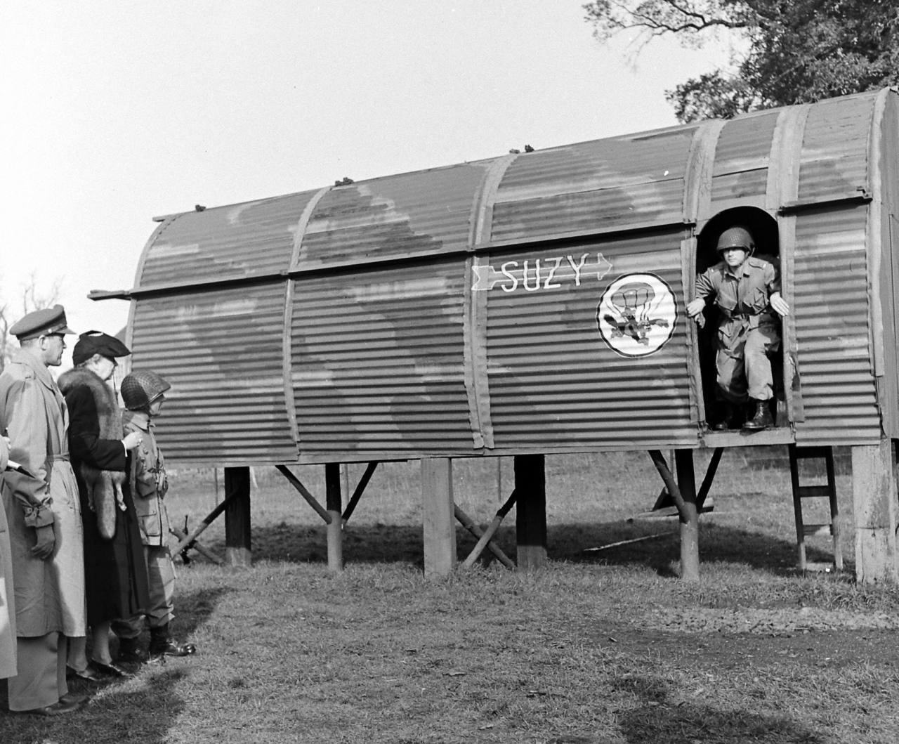 The 2/503rd PIR had this aircraft and door exit procedure trainer built on the grounds at Chilton Foliat, England in 1942. It was named Suzy after the lady of the estate in which the 509th was using as their billets and training facility. You can see next to the door the Cat Patch painted in the original round patch design. First Lady Elenor Roosevelt stands next to Lt Col. Edson Raff, Battalion Commander and another unknown officer while observing demonstrations of parachute training by an unknown lieutenant.