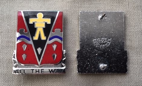 SYMBOLISM: The stylized yellow (gold) figure of a parachutist on a black background is adapted from "Little Man in the Door" the patch worn by the regiment during World War II and by which it was known throughout the Mediterranean Theater. The red field alludes to the red berets worn by the British 1st Airborne Division and the close association between it and the regiment during World War II in England and North Africa. The nebuly (heraldic delineation for water) white and blue bars (the colors blue and white are used for Infantry) refer to the record breaking flight from England parachuting into North Africa on 8 November 1942. The two segments of the wavy blue bar simulate the streamers of the Presidential Unit Citations (Army) awarded for the gallant actions at Careno, Italy and Leige, Belgium, and in being a heraldic symbol of water refer to the amphibious landing on the Anzio-Nettuno beachhead on 22 January 1944. The black pile simulates a parachute jump and in also being a heraldic symbol used frequently for engineers, the two sides refer to the ground defense the organization participated in during the Anzio and Ardennes-Alsace (Battle of the Bulge) campaigns. The five arrowheads are for the five assault landings made by the regiment in World War II. A silver scroll with the black letters, "ALL THE WAY" is the motto of the Airborne and the regiment.