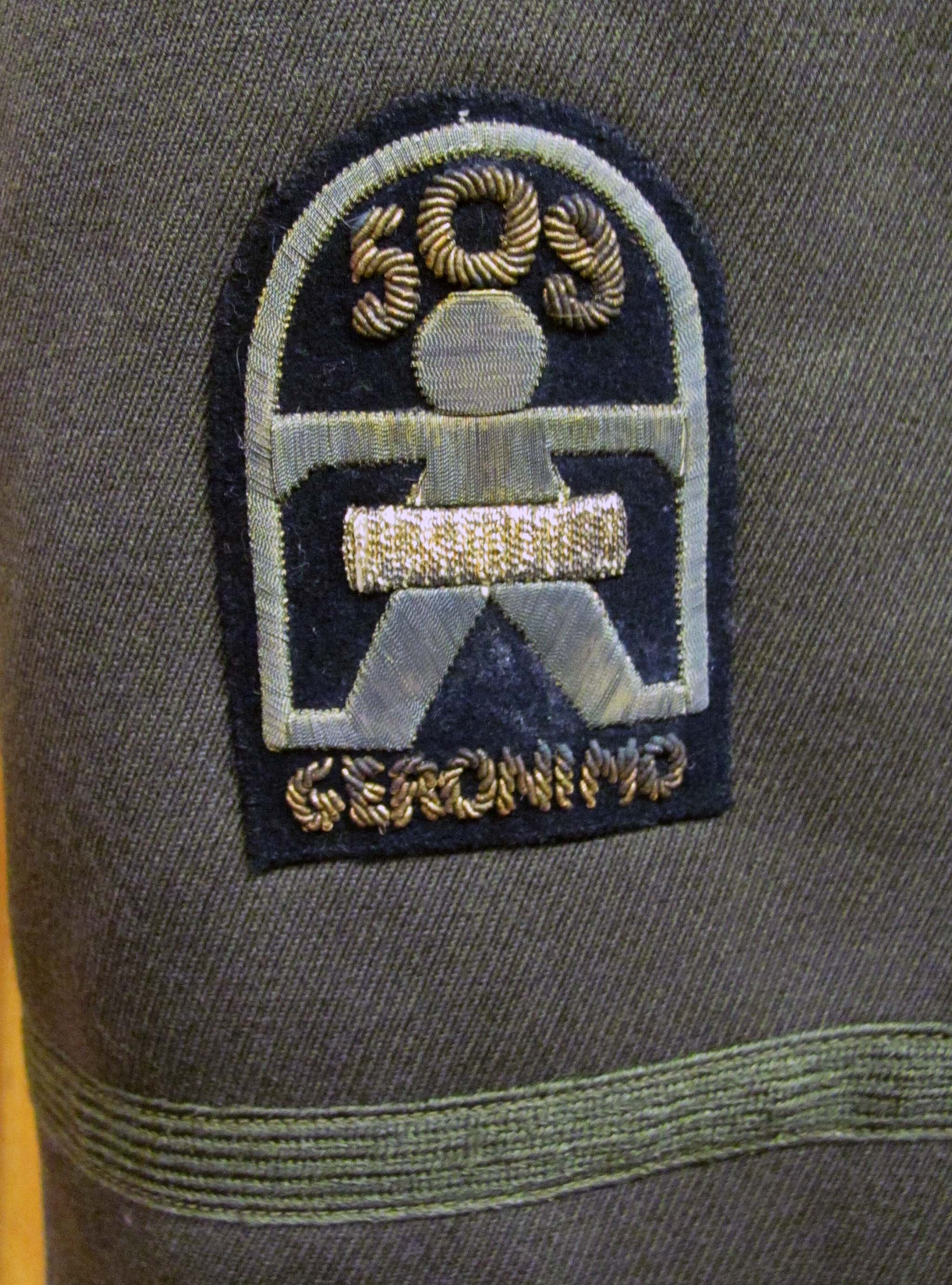 In October 1943 the 509th PIB was detached from the 82nd Airborne Division and was attached to the U.S. 5th Army. To distinguish and instill pride in the unit, Lt Col. Yarborough directed Henry "Bud" Pardieck to design a patch. The stick figure was reminiscent of the Native American paintings. The design became an instant hit with the troops. The patch was made in Piscinola, Italy, local seamstresses were paid in bartered goods. The patch was never officially recognized by the Department of the Army, however, it was locally authorized for wear by General Mark Clark while the unit was guarding 5th Army Headquarters in Italy, and subsequently worn by members of the 509th for the remainder of World War II. Typically, this patch was worn on left chest of winter 'tanker' combat jackets, A-2 leather jackets, B-10 jackets, M41 field jackets and the B-3 leather jacket. Renowned for their tongue-in-cheek humor, the Paratroopers of World War II began referring to the Geronimo Patch as the Gingerbread Man due to the appearance of the Little Man in the Door a term that has remained associated with the patch to this day.