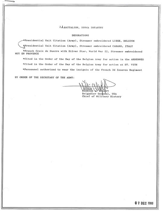 *Cited in the Order of the Day of the Belgian Army for action in the Ardennes - DA GO 43, 1950
