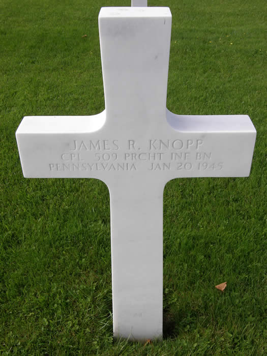 20 Jan 1945 - Cpl. James R. Knopp 33108212 509th PIB Hometown: Lilly, PA, Buried: Plot C Row 12 Grave 23 Henri-Chapelle Am Cem, Henri-Chapelle, Belgium Awards: Purple Heart with Oak Leaf Cluster, Page: 389 Book: Stand in the Door by Charles H. Doyle and Terrell Stewart