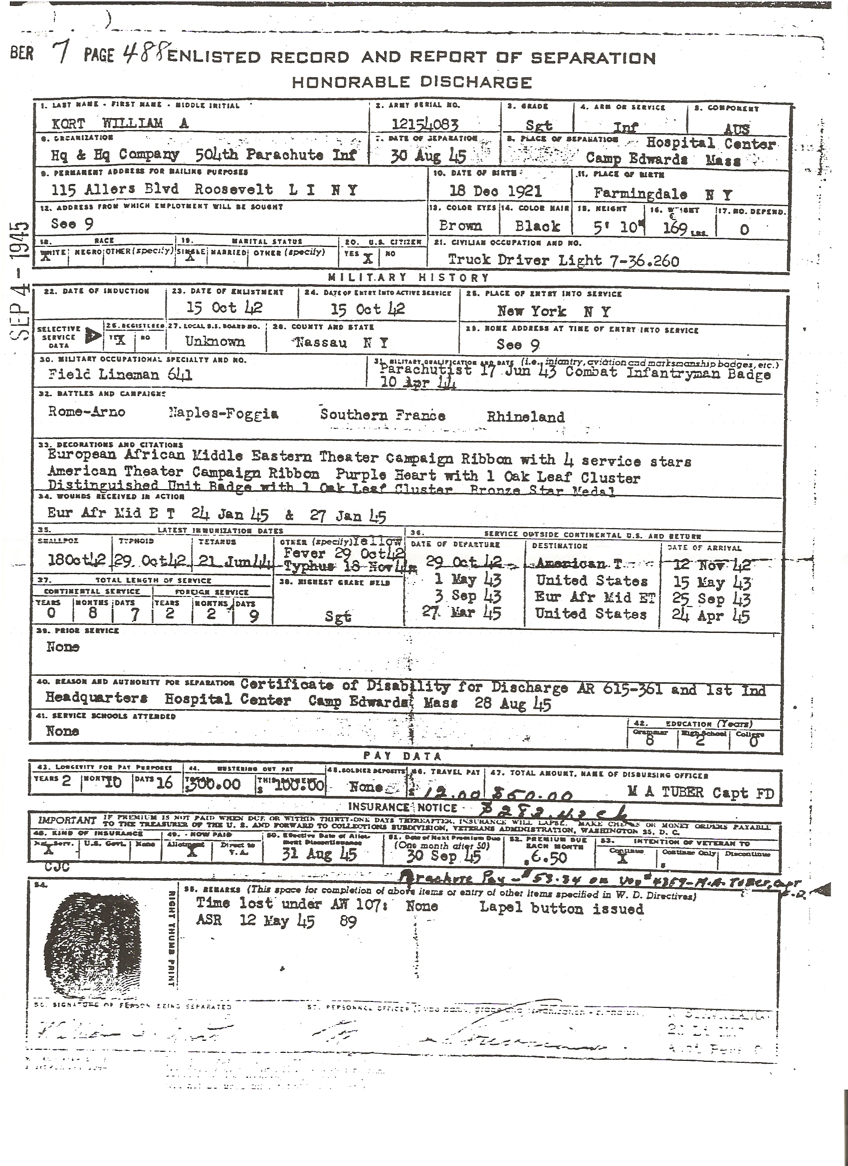 CAMPAIGNS: Rome-Arno, Naples-Foggia, Southern France, Rhineland (Note: participated in the Ardennes-Alsace Campaign however it is not officially documented on his discharge papers)