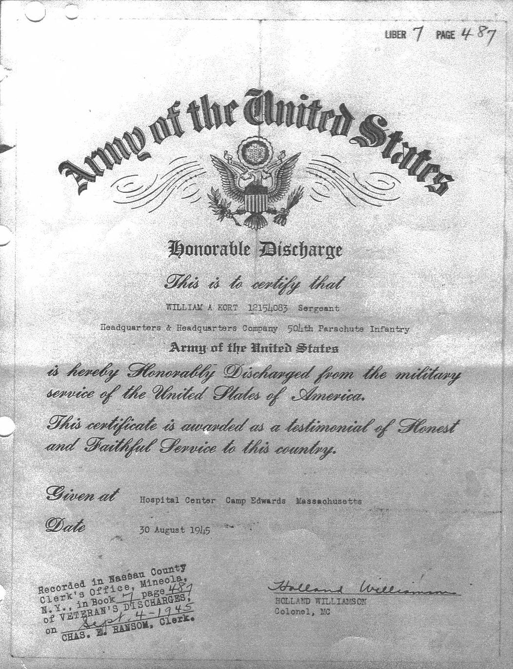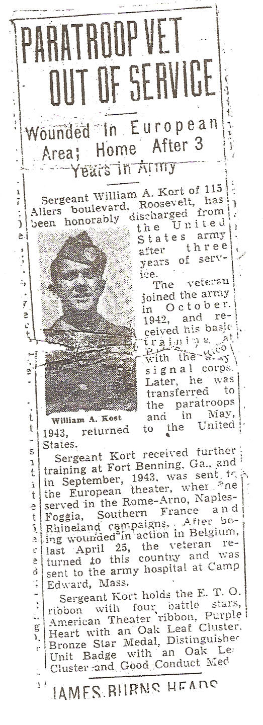 My name is William A. Kort. I was born on December 18, 1921 in Farmingdale, New York. On October 15, 1942 I enlisted in the United States Army. I eventually became a parachutist which is what I had always wanted to become. I became a sergeant with the 509th Parachute Infantry Battalion. While this unit was not very well known they have more First, Unit and Individual Citations than any other parachute organization in the army. We were what is commonly called a “Bastard Battalion” similar to an orphan with no real mother or father. We went where we were needed and wound up working for any or all of the Generals such as we did. Because of overuse we ultimately were wiped out and on March 1st of 1945 we were disbanded. Those of us who survived were reassigned to other airborne units although most physically never went there. Personally my discharge shows me as a member of Headquarters and Headquarters Company of the 504th Parachute Infantry. As I had never been there I don’t know if they were part of the 82nd or 101st Airborne.