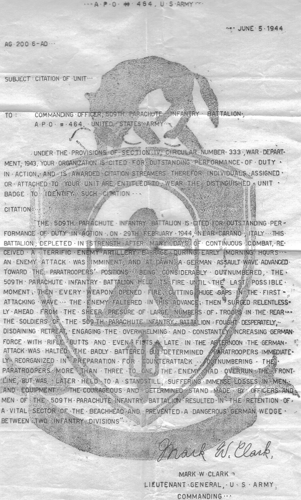 UNIT ASSIGNED: A Company, 509th Parachute Infantry Battalion