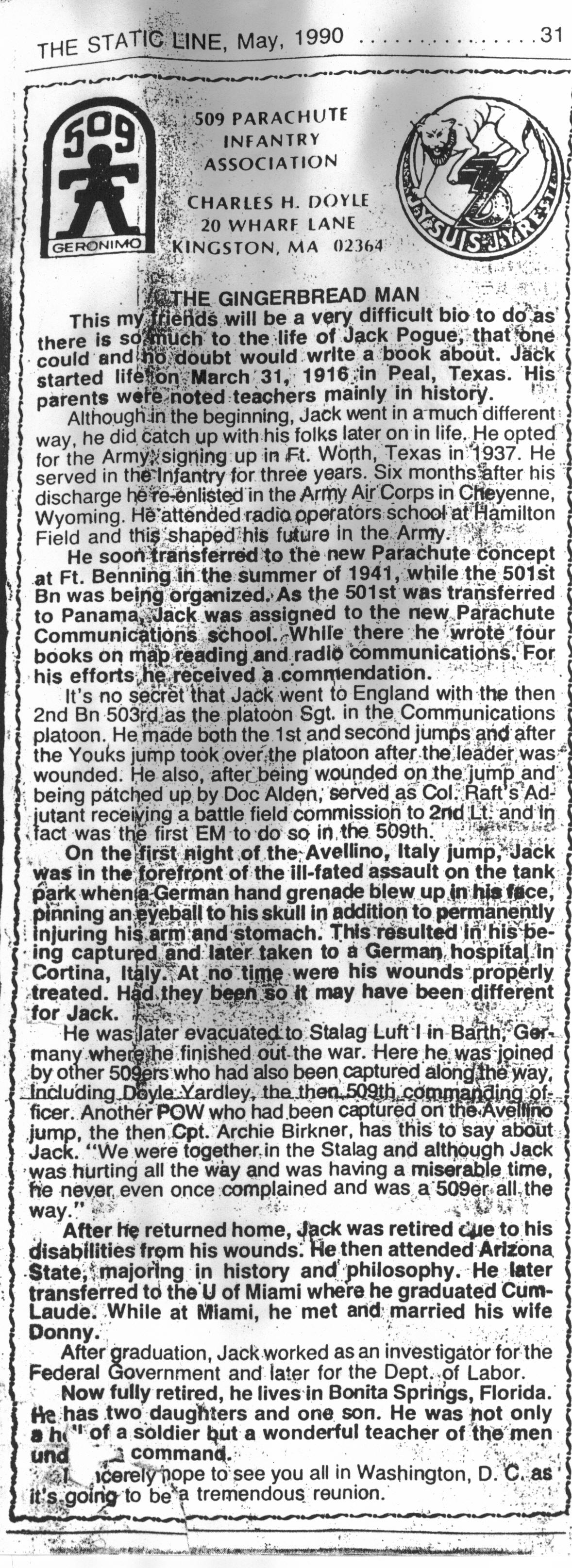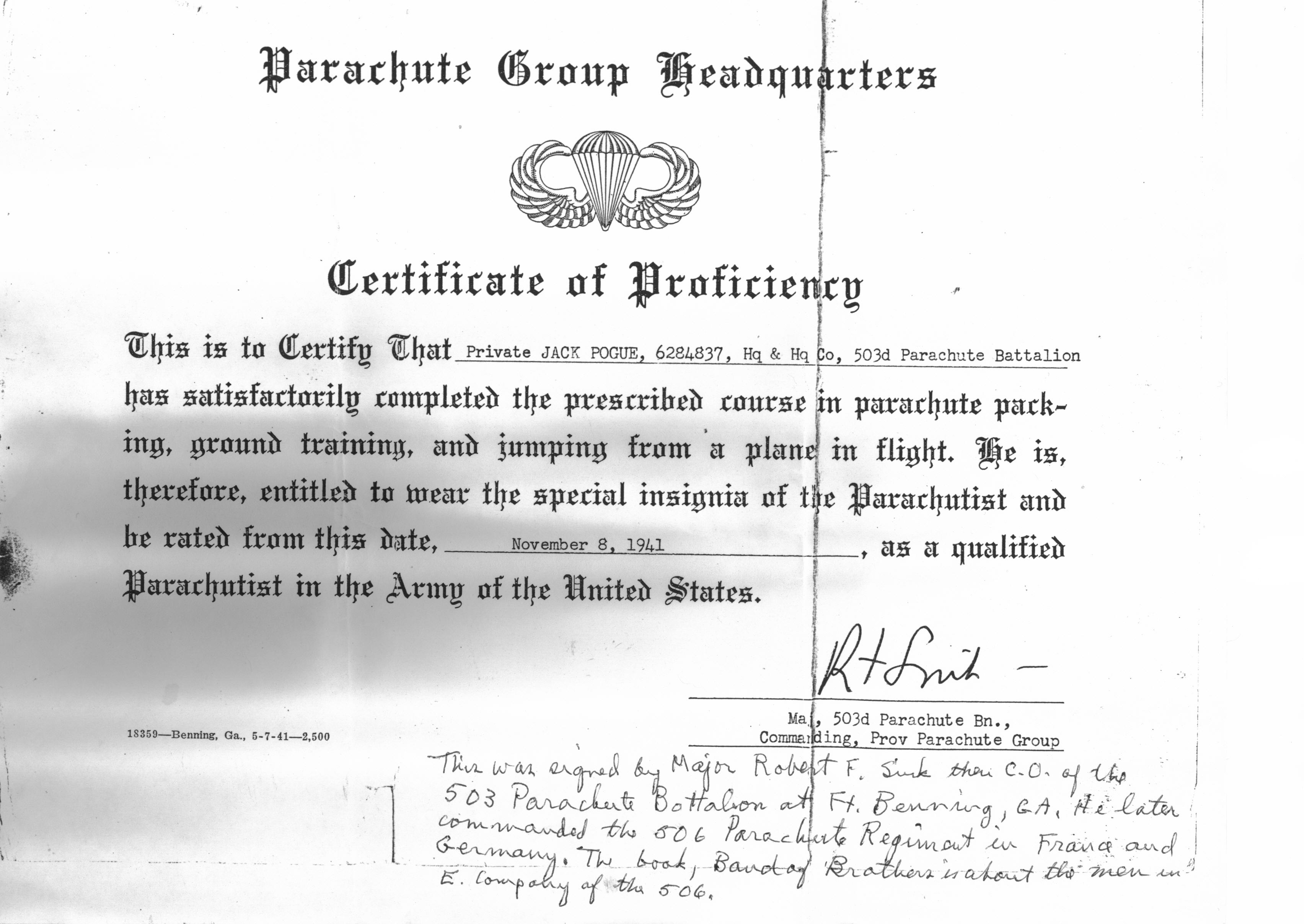 15 August 1943 - 1st Lt. Jack Pogue O-885620 HHC 2nd Bn 509th PIR 27-Aug-40 15-Jul-43 GO8 Awarded Good Conduct Medal, 3yrs svc Formerly SSgt.