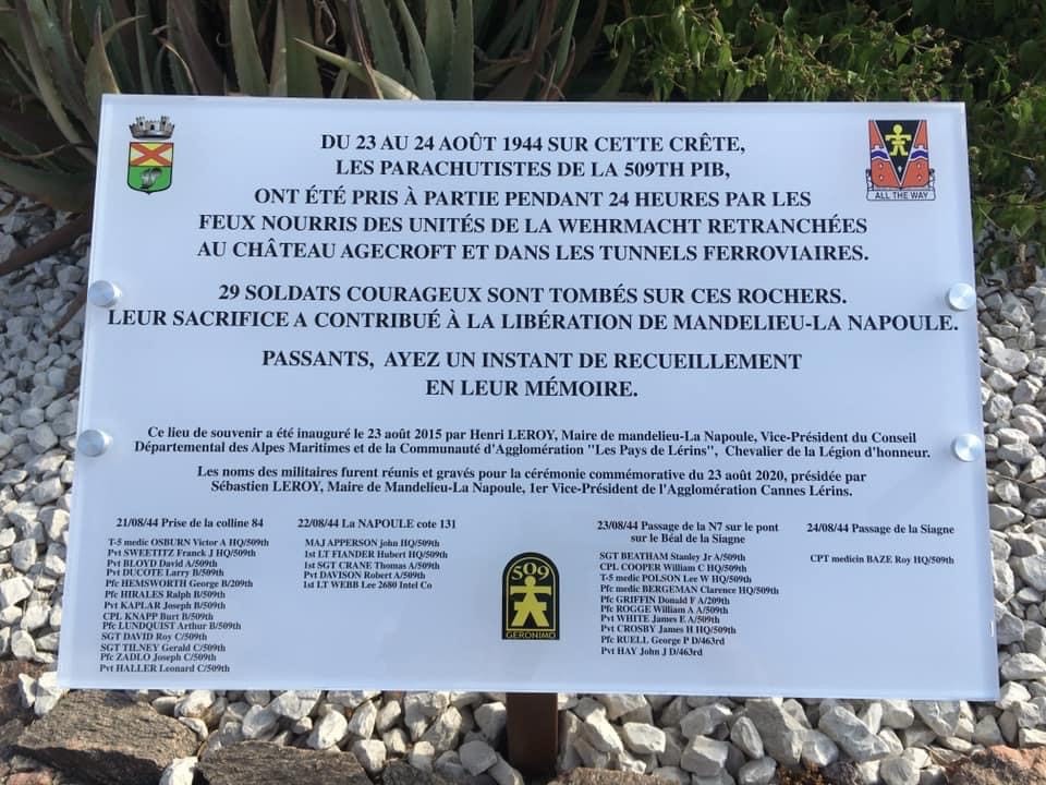 This place of remembrance was inaugurated on August 23, 2015 by Henri LEROY, Mayor of Mandelieu-La Napoule, Vice President of the Couseil Departemental des Alpes Maritimes and of the Community of Agglomeration "Les Pays de Lerins", Knight of the Legion of Honor.