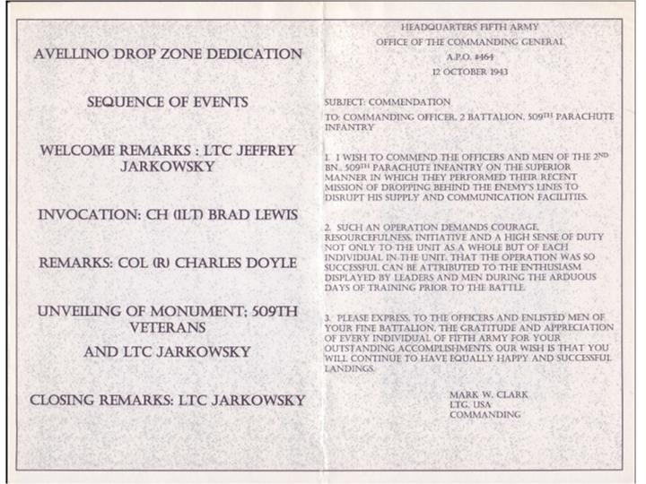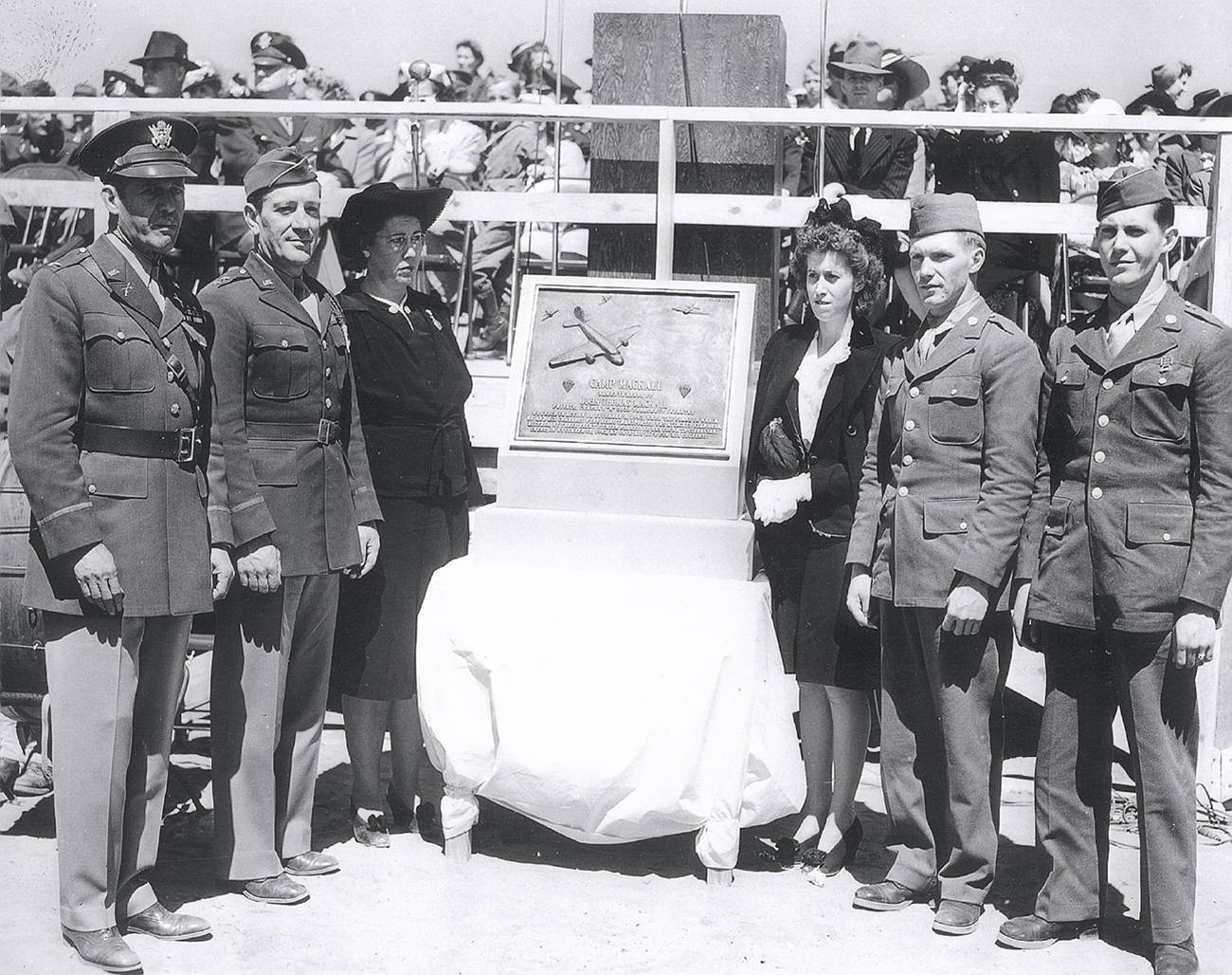 Above is the first monument to the 509th. The dedication ceremony on May 1, 1943, by General Order Number 6 dated February 8, 1943 which named Camp MacKall in honor of Pvt. John Thomas MacKall who died of wounds received on November 8. 1942. Left to right: Col. Olsmith, Camp Commander; Gen. Chapman, Commander - Airborne Command; Ms. MacKall, Mother; June MacKall, Sister; Pvt. Gerald MacKall, Brother KIA July 7, 1944 near St. Lo, France; Pvt. Robert MacKall, Brother.