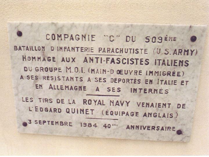 (In the courtyard of the church at the border of Cap D'Ail, France and Principality of Monaco commemorating the liberation of the area by Co. C. 509th PIB. The plaque on left was placed on the church wall on Sept. 1945. The plaque on the right was added during the celebration of the 40th Anniversary in 1984.)