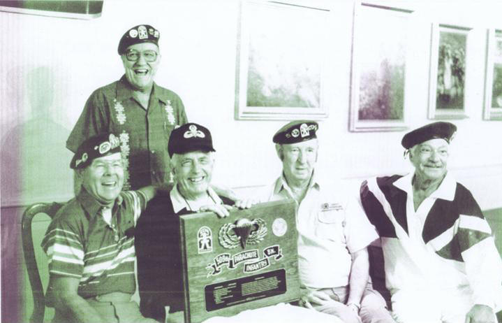 (Left to Right: John Devaine, Charlie Doyle [standing], 'Bud' Seigel, Harvey Sutherland, Nick DeGata. picture was taken in Plymouth, Massachusetts. The plaque was hand carried by George Fontanesi to The Allied Museum, Nettuno, Italy.)