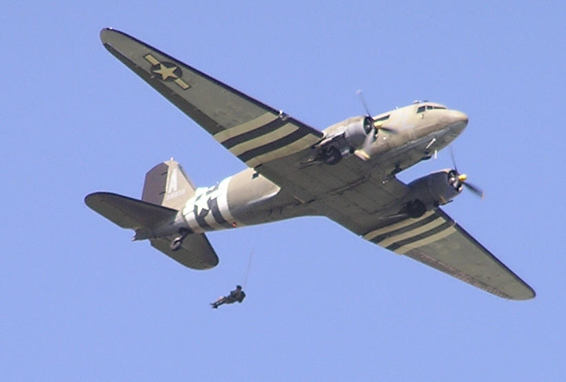 (Soldiers of the 1st Battalion, 509th PIR stationed at Fort Polk, LA execute a flawless parachute operation from two C-47s onto the newly dedicated General William P. Yarborough Drop Zone at Wright-Patterson AFB, Dayton, Ohio in 2006 before an audience of World War II Veterans attending the 509th PIA Reunion.)