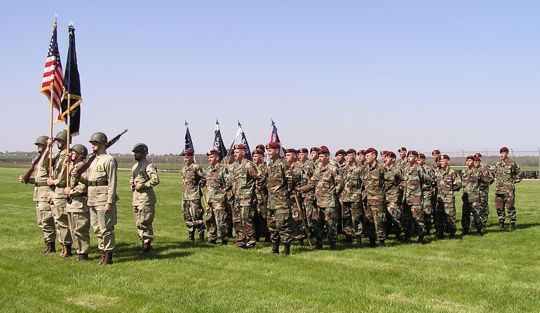 (Soldiers of the 1st Battalion, 509th PIR stationed at Fort Polk, LA march off the newly dedicated General William P. Yarborough Drop Zone at Wright-Patterson AFB, Dayton, Ohio in 2006 before an audience of World War II Veterans attending the 509th PIA Reunion.)
