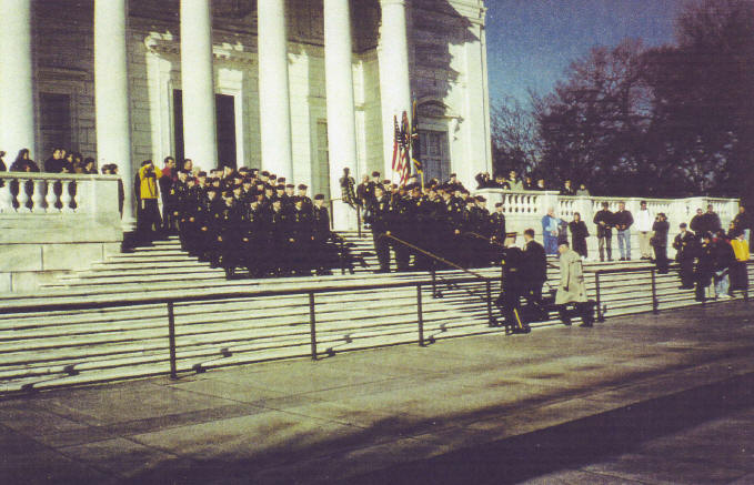 (Members of the 509th at the Tomb of the Unknown participate in the wreath-laying ceremony and dedication of unit plaque placed inside the Memorial Display Room at Arlington National Cemetery, Arlington, Virginia in January 2000)