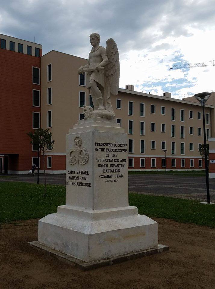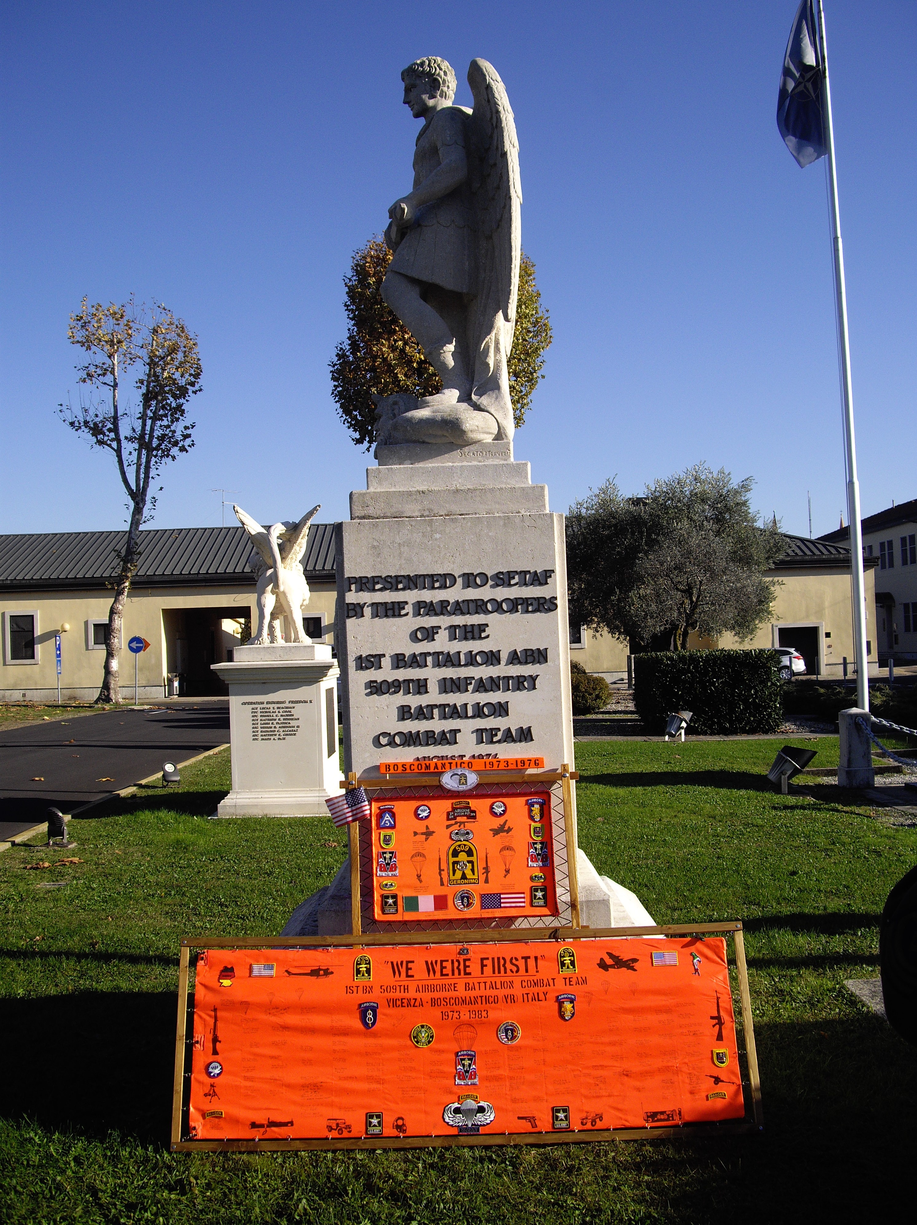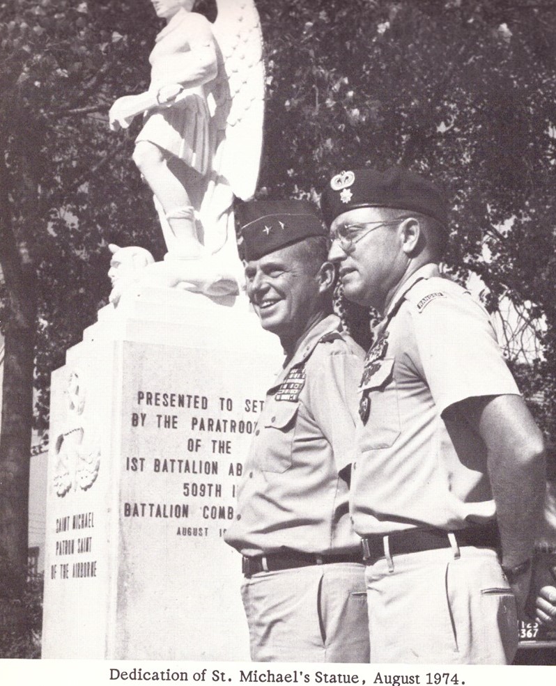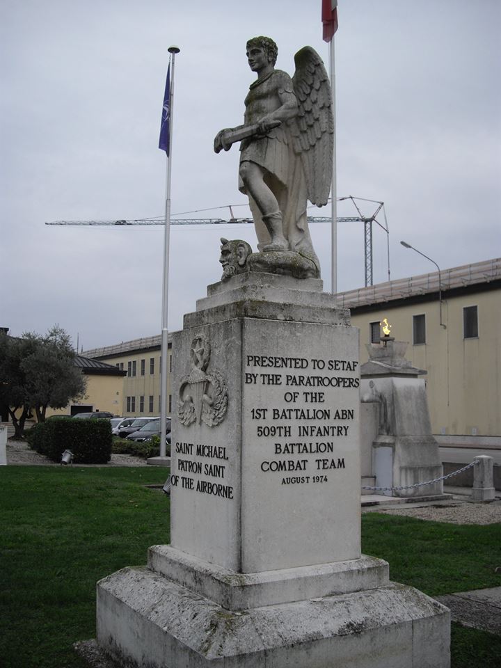 Back in 1973, when we ol'509ers came down from Germany to Vicenza. There was only one statue on Caserma Ederle and it belonged to the 559th Artillery Group. And so naturally, we 509th Airborners didn't like this "LEG" statue. And so someone, some NCO finally came up with an idea and started collecting money so we could have our own statue built and dedicated to us - 509th Airborne Battalion Combat Team. After this one NCO and some others started collecting money is when some 509th officers got involved and started helping out with it too. Soon this collection of money kept growing and growing and growing until we had more than enough needed to have our Saint Michael statue built. And the rumor was.. which was probably true.. the 509th wanted a much bigger, larger, better, taller, statue than the 559th (LEG) Artillery statute. But the idea was reportedly shot down by the SETAF Commanding General. And he supposedly told our battalion commander if we wanted a statue of our own, it had to be the same size as the 559th statue. So what you see today in front of 173rd Abn Bde HQs is what we ol'509ers all chipped in and paid for to have built back in 1974 without any financial assistance from the Army nor the SETAF command. And the photo you see was taken at the unveiling dedication ceremony with the Commanding General standing alongside our 509th Battalion Commander, LTC. Ward M. Le Hardy. (images and caption provided by "Ranger Rick" F. Tscherne, US Army, Retired, 1972-93)