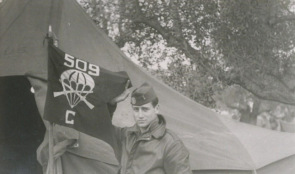 Lt. John Kessler displays the C Company 509th PIB Guideon in Southern France