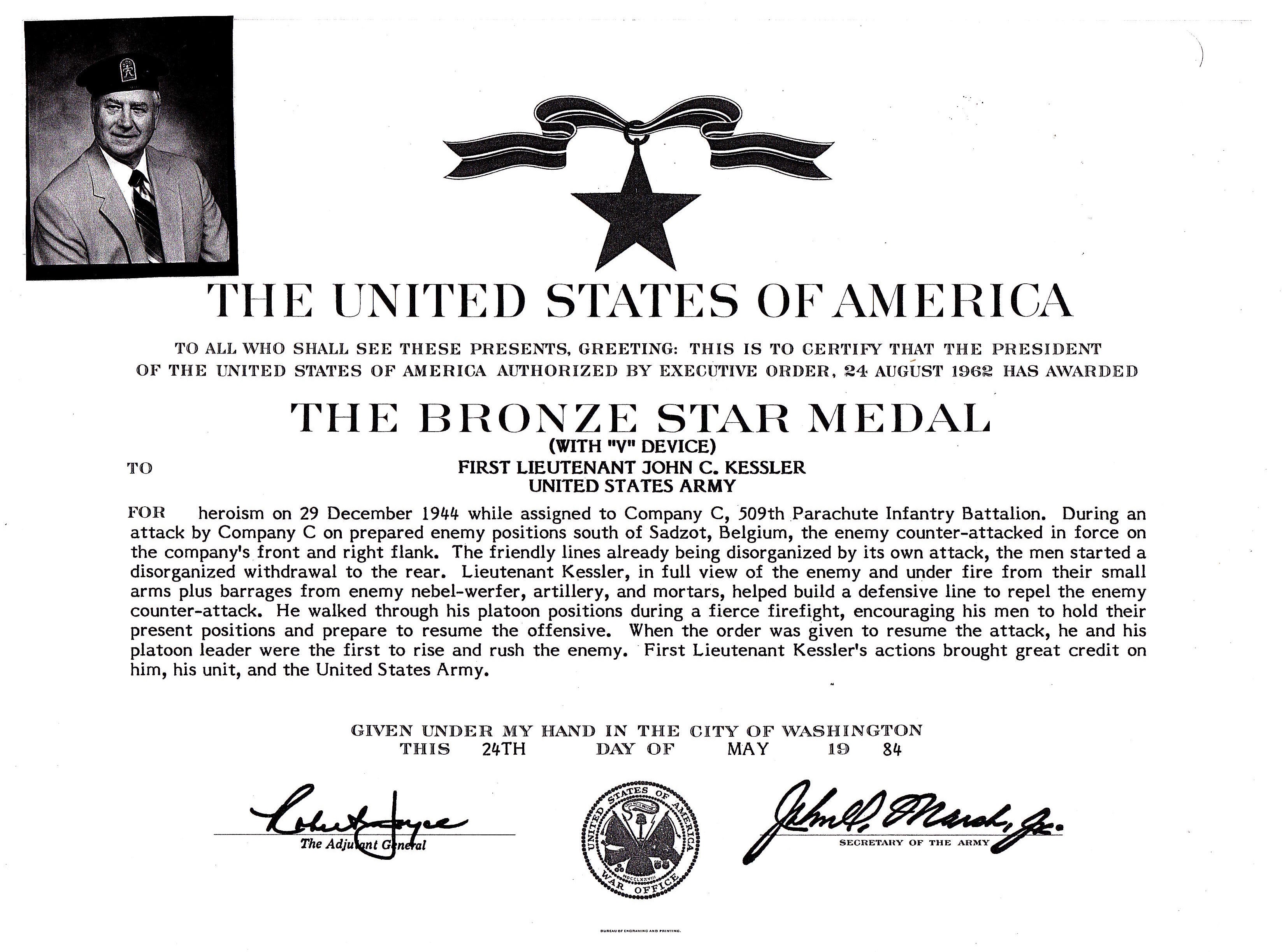For heroism while assigned to Company C, 509th Parachute Infantry Battalion, During as attack by Company C on prepared enemy positions south of Sadzot, Belgium, the enemy counter-attacked in force on the company's front and right flank. The friendly lines already being disorganized by its own attack, the men started a disorganized withdrawal to the rear. Lieutenant Kessler, in full view of the enemy and under fire from their small arms plus barrages from enemy Nebel-Werfer artillery and mortars, helped build a defensive line to repel the enemy counter-attack. He walked through his platoon positions during the fierce firefight, encouraging his men to hold their present positions and prepare to resume the offensive. When the order was given to resume the attack, he and his platoon leader were the first to rise and rush the enemy. First Lieutenant Kessler's actions brought great credit on him, his unit, and the United States Army.
